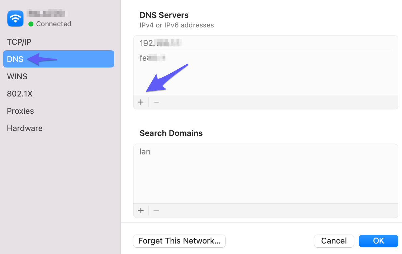 3. In the new window, select the DNS section. After that, you will be able to add ( + ) or remove ( - ) DNS entries. Remove the present DNS addresses and click on + to add the following DNS entries: 8.8.8.8 and/or 8.8.4.4.