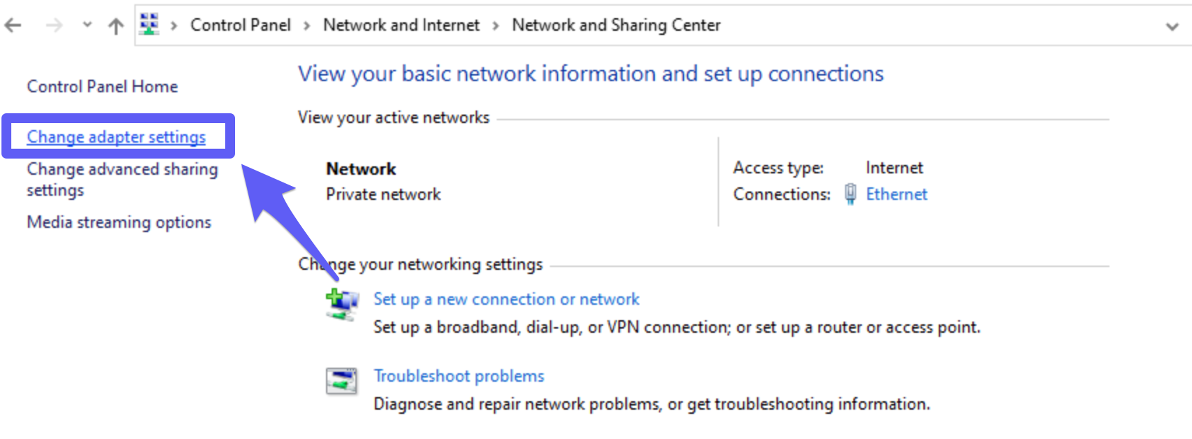- On the Control Panel, go to the Network and Internet tab and then select Network and Sharing Center. After this, select Change adapter settings from the left panel.