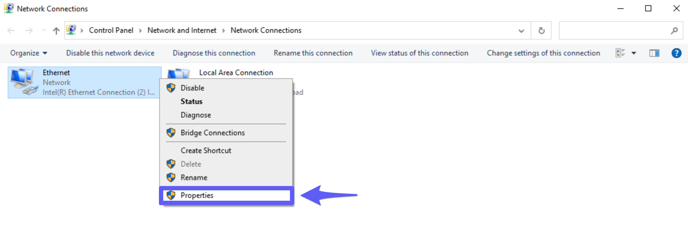- Next, right-click on the currently active network adapter and select the Properties tab. You can identify the active adapter by the green connection bar displayed next to it.