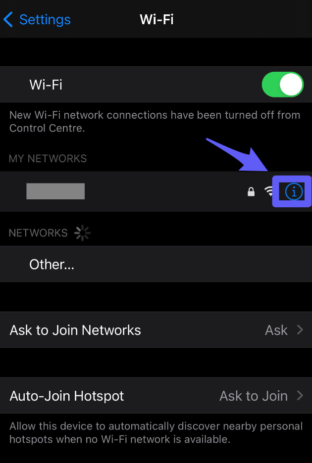 - Open the Settings on your device, go to Wi-Fi, and tap on ℹ️ next to the connected Wi-Fi.