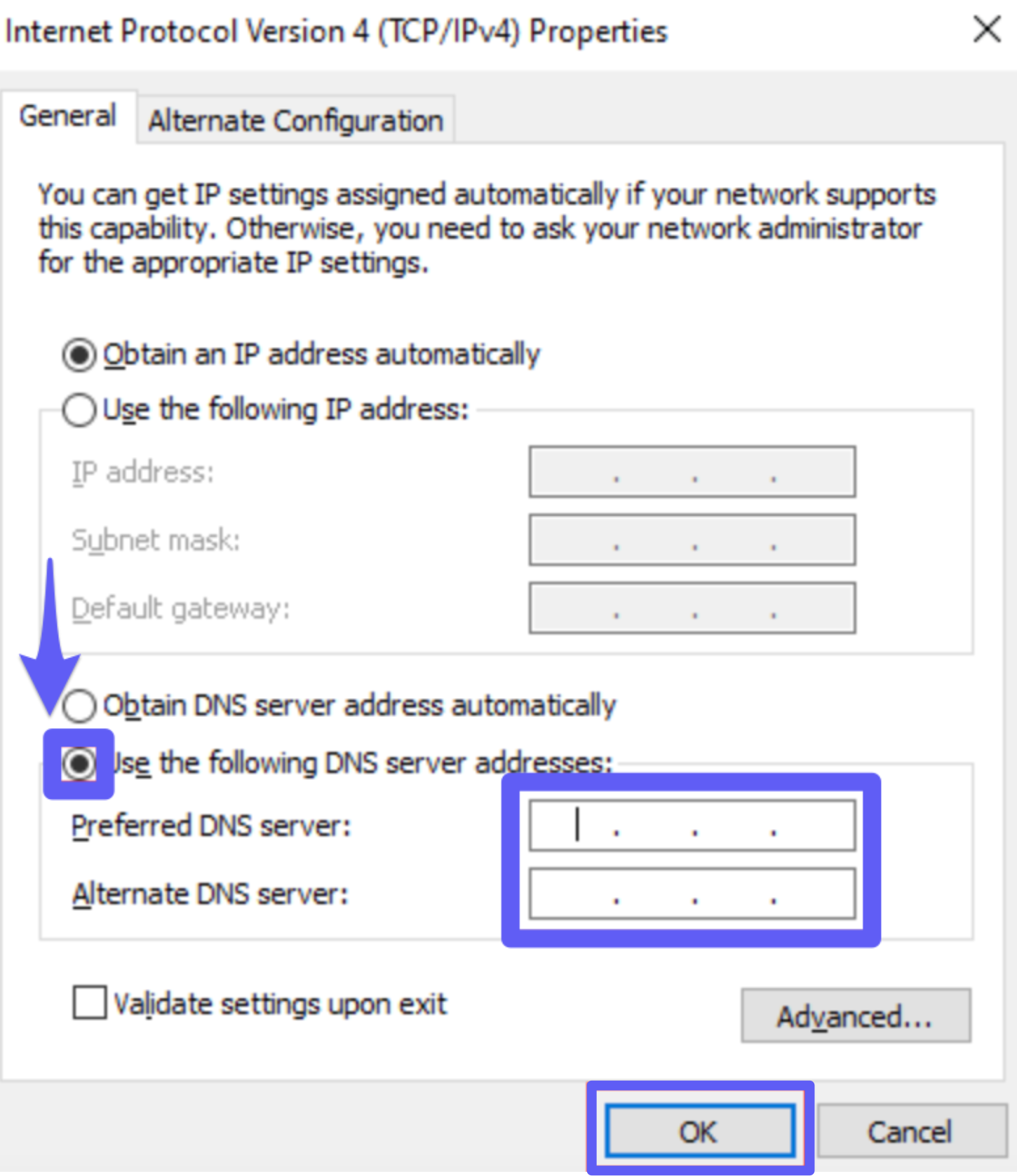- Mark the Use the following DNS server addresses bubble, and enter the following DNS addresses: 8.8.8.8 and/or 8.8.4.4. After this, click OK to submit.