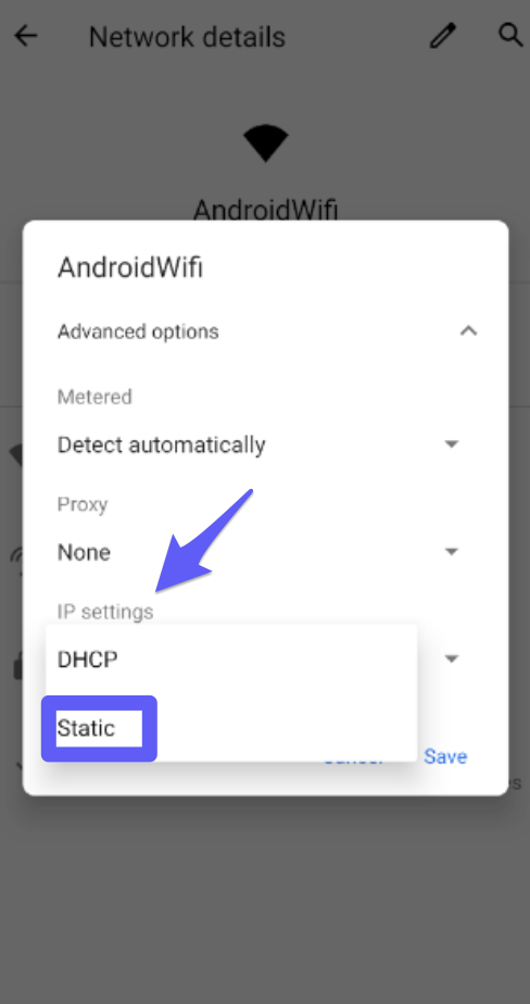 - Go to Advanced options, scroll down, and on IP Settings select Static.