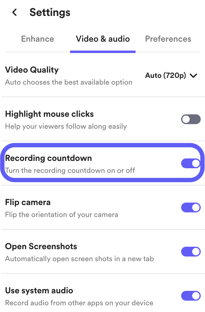 Please note that even with the countdown timer disabled, you might still experience issues. To workaround this, we recommend using a Custom Size recording and cropping the screen to your desired area, or opting to record a specific window.
