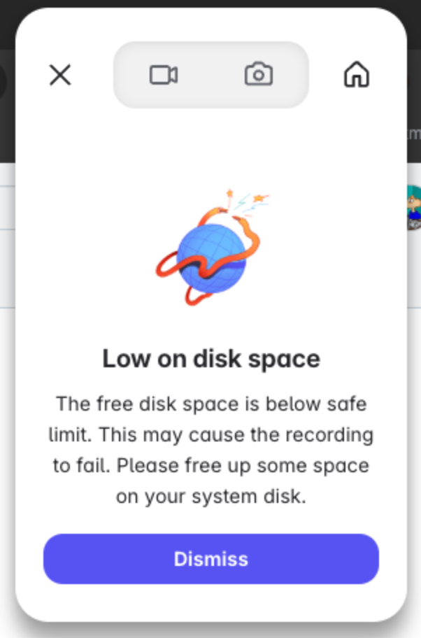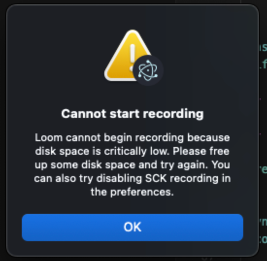 Loom temporarily saves your recording files to your computer’s disk space while you record. If your device doesn’t have enough free disk space, Loom may not be able to record reliably, which could lead to crashes or lost recordings. To prevent this, Loom checks your available disk space before starting a recording.