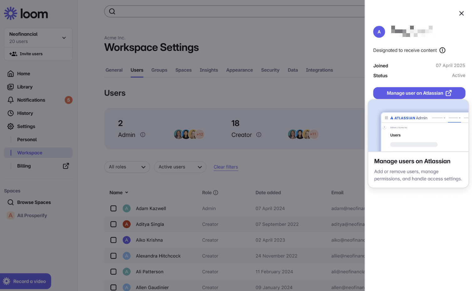 You'll have a new centralized hub, Atlassian Administration, for managing all your Admin controls and settings. Following your workspace integration, you'll manage your billing and users in Atlassian Administration (instead of in your Loom workspace settings).