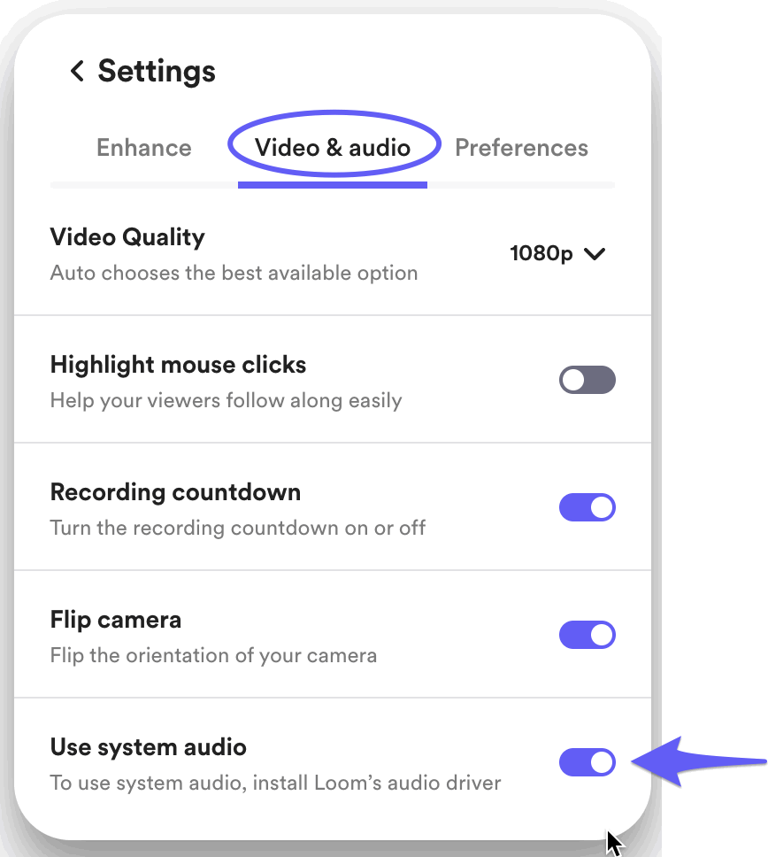 - In your Loom App configuration: make sure to enable Use system audio in your preferences before recording and set up your Loom audio settings to your desired microphone as usual.