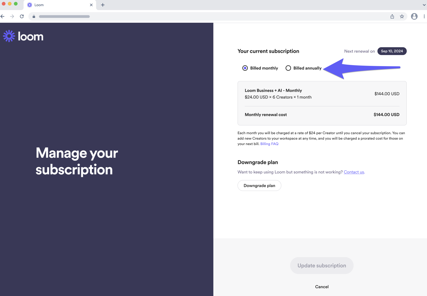 Under Your Current Subscription, you can switch from Billed monthly to Billed annually (the price below is used for illustration, the price will vary based on location & upgrade date).