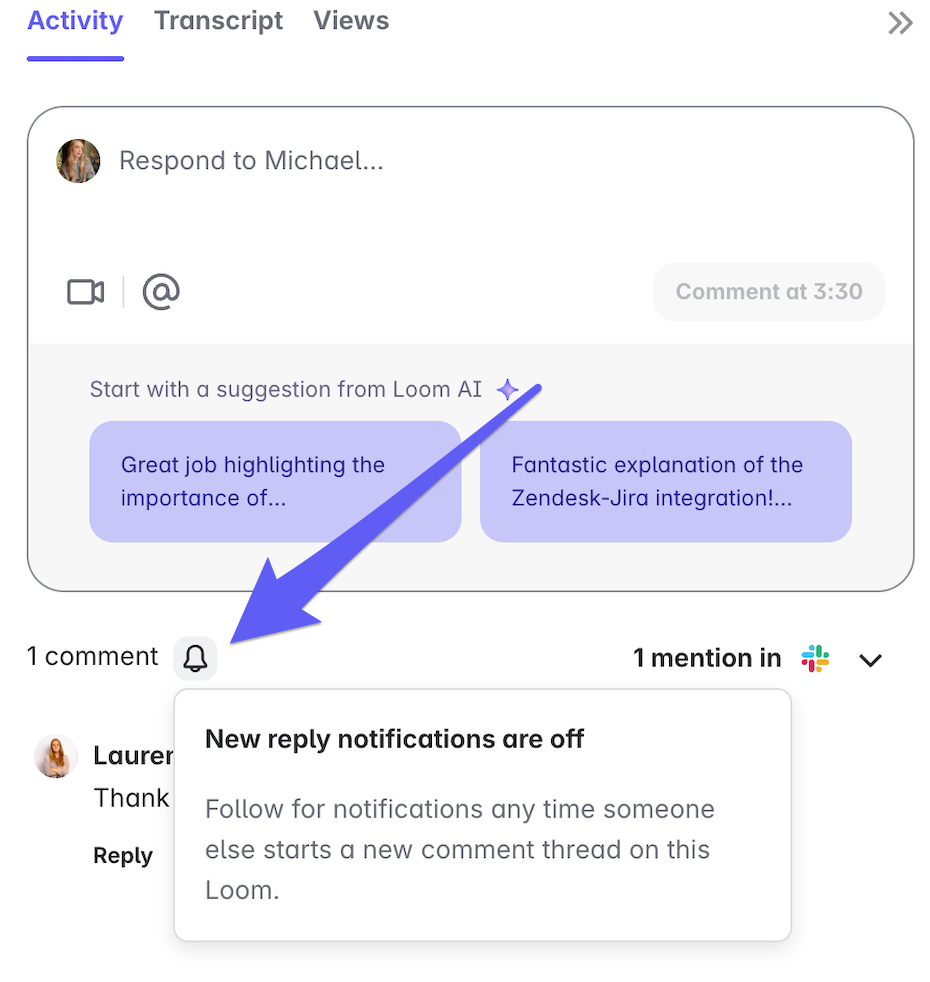 Follow comments on other people's videos. Following a Loom will notify you of new comments and you can always unfollow at any time. To edit notification preferences visit your settings here.