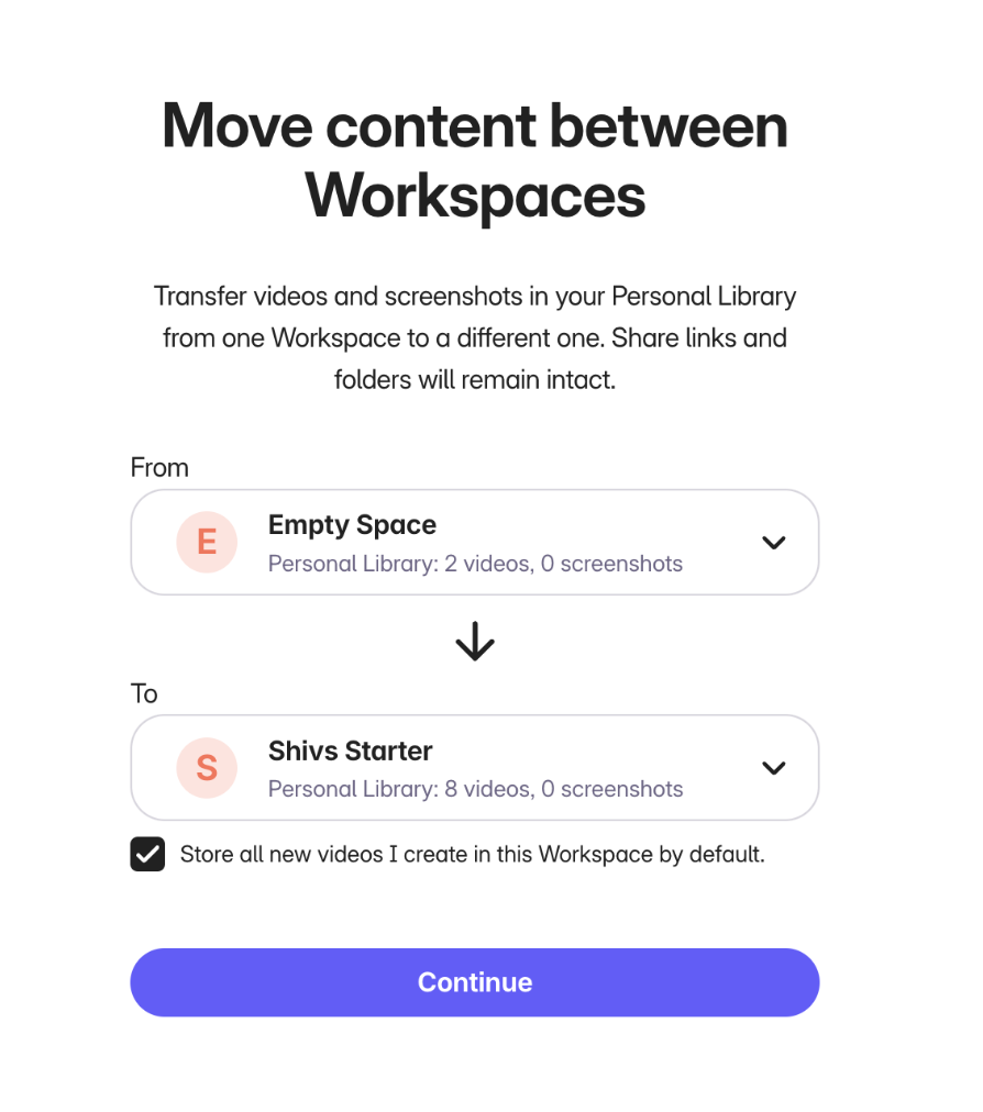 If you're an existing Loom user who wants to join your teammate's Workspace, you may want to be able to transfer your content from your old Workspace to your team's Workspace. This allows you to keep all your content in one place and leave old Workspaces without losing content.