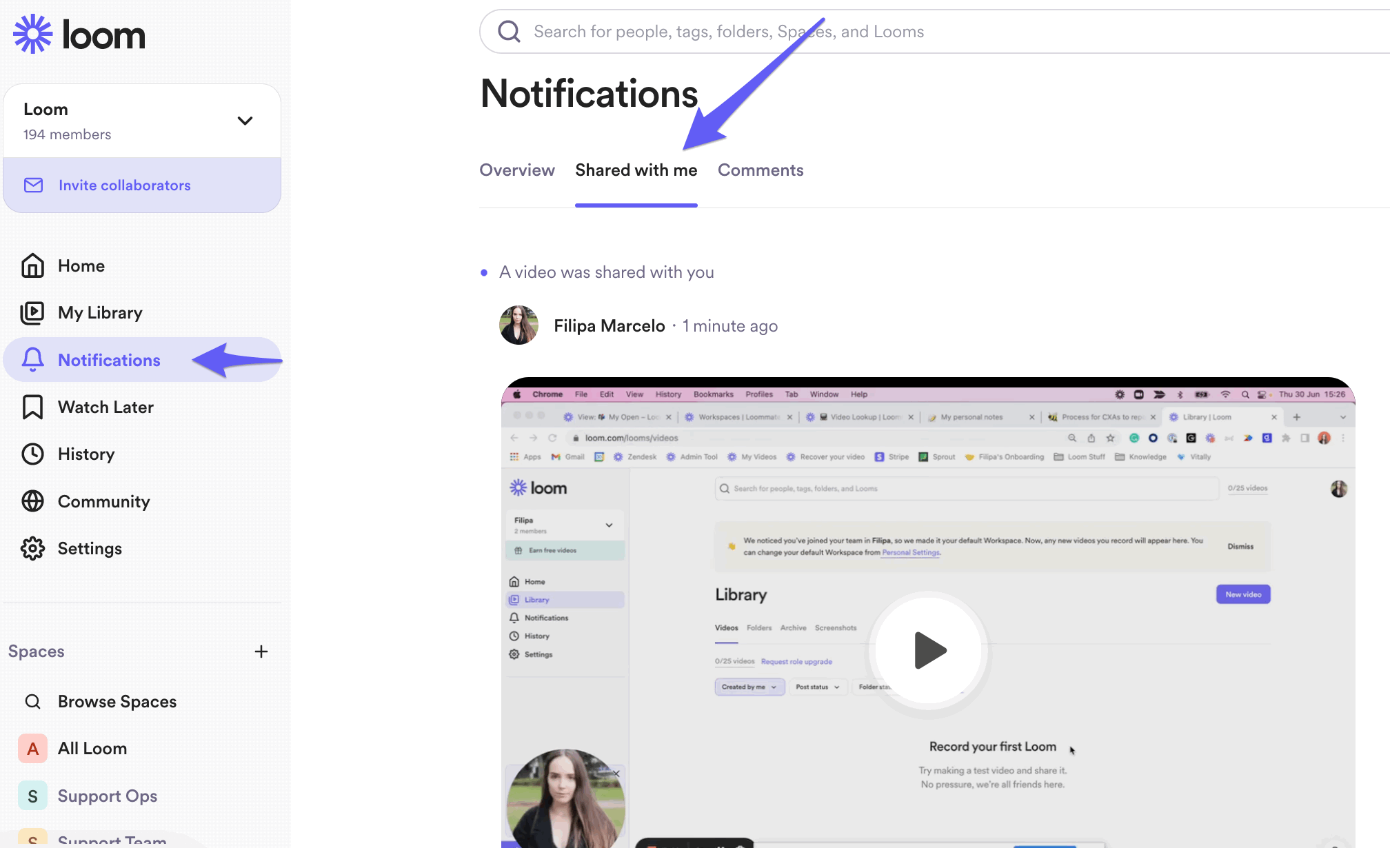 To view all videos shared with you, navigate to your Notifications from your Workspace's sidebar. From here you can toggle over to the Shared with me tab.