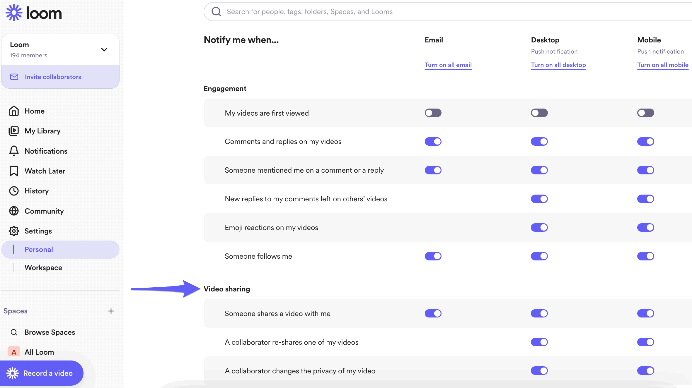 You can manage how you are notified when a new video is shared with you from your Personal Settings. Under the Notifications tab in your Personal Settings, you can choose to turn on or off notifications via email or from within the desktop and mobile apps.